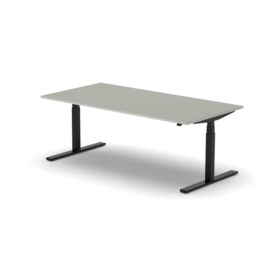 blad van spaanplaat met onderhoudsvriendelijke melamineharscoating in decor MB White Grey. plaatvorm rechthoekig. T-voetonderstel in RAL9005 gitzwart. hoogteverstelling door elektromotor met handschakelaar en display. functies: Opslaan en automatisch oproepen van geprogrammeerde tafelhoogtes dankzij memoryfunctie. met eurostekker.