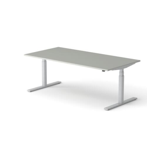 blad van spaanplaat met onderhoudsvriendelijke melamineharscoating in decor MP Platinum. plaatvorm rechthoekig. T-voetonderstel in RAL9006 blank aluminiumkleurig. hoogteverstelling door elektromotor met handschakelaar. met eurostekker.