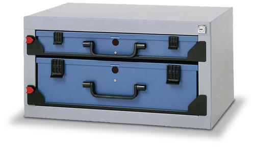 van staal, romp met met slag- en krasvaste poedercoating in RAL7000 pelsgrijs. 92FF09139862E3468F8DC738014A9BE9. De enkele uittrekstop voorkomt dat meerdere laden tegelijk worden geopend en voorkomt omvallen. Afsluitbaar via veiligheidsslot. 2 koffers. koffer van staal. koffer met met slag- en krasvaste poedercoating in RAL5007 briljantblauw. bakken in gekleurd.