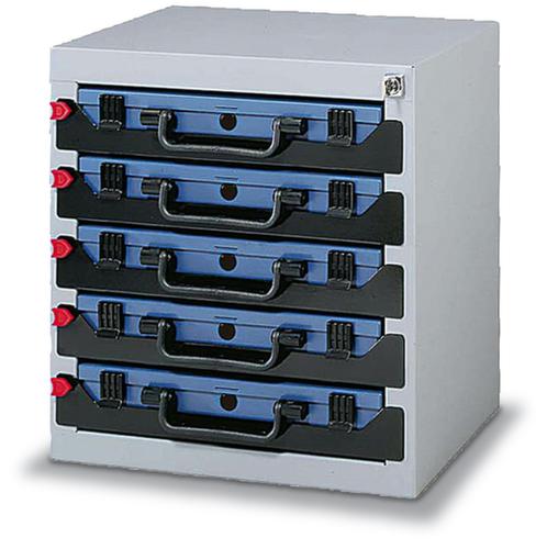 van staal, romp met met slag- en krasvaste poedercoating in RAL7000 pelsgrijs. 92FF09139862E3468F8DC738014A9BE9. De enkele uittrekstop voorkomt dat meerdere laden tegelijk worden geopend en voorkomt omvallen. Afsluitbaar via veiligheidsslot. 5 koffers. koffer van staal. koffer met met slag- en krasvaste poedercoating in RAL5007 briljantblauw. bakken in gekleurd.