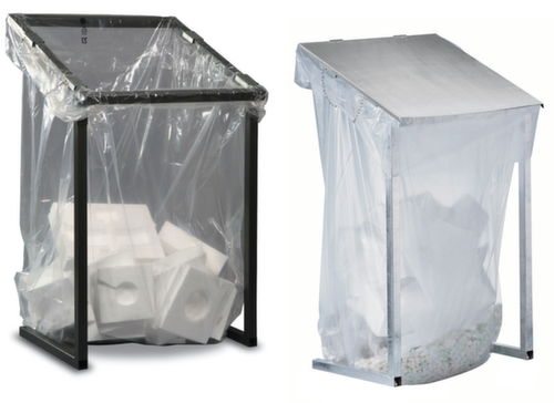 "longDescription": "<h2>Vuilniszakstandaard voor grote zakken</h2><strong>met bijzonder brede vulopening voor gemakkelijke verwijdering</strong><br><ul><li><strong>Robuust frame</strong> van vierkante buis</li></ul><br><h3>Bestel direct:</h3><ul><li><strong>mobiel</strong> - bijpassende wielenset</li></ul><br><h3>De keuze is aan jou:</h3><ul><li><strong>meer bescherming voor de inhoud</strong> - naar keuze met deksel</li><li><strong>corrosiebestendig of slag- en krasvast</strong> - frame verzinkt of met poedercoating</li></ul><br>Deze afvalverzamelaar voor 1000 liter zakken is het ideale inzamelstation voor lichte materialen zoals opvulmateriaal, polystyreen, folie of PET-flessen. De bijzonder brede vulopening maakt een gemakkelijke verwijdering mogelijk. Door dergelijke afvalverzamelaars te installeren in grote produktiehallen of opslagplaatsen of op andere plaatsen waar zich veel afval ophoopt, kan een bijdrage worden geleverd aan een doeltreffende milieubescherming.<br><br>Het insteekbare stalen frame kan naar behoefte snel worden gemonteerd en gedemonteerd. Toch is hij absoluut stabiel en stevig. Kies tussen een afvalbak met of zonder deksel.<br>",