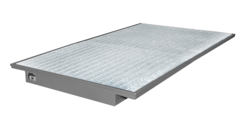 "metaDescription": "Ophangbak met rooster - opvangvol. 200l, HxBxD 140x2150x915mm, m. rooster, staal, RAL7005",