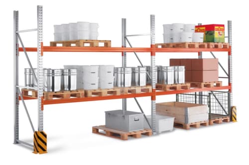 de belangrijkste maten van de META palletstelling MULTIPAL in één oogopslag:10 stellingvelden met elk 3 niveau(s) met traversen bieden opslagcapaciteit voor in totaal 120 pallets. vakhoogtes zijn afhankelijk van het doel en uw behoeften verstelbaar in stappen van 50 mm. Elk stellingveld biedt 12 palletplaatsen (incl. vloeropslag). opslag in de lengte. draagvermogen per pallet 470 kg. hoge stabiliteit door gesloten kokerprofielen. De langsliggers worden snel en ongecompliceerd in de staanderframes gehangen en met borgstiften bevestigd. gebruik eenzijdig – vrij opstelbaar in de loods, maar toch geoptimaliseerd voor een eenzijdige bediening, zodat ladingen veiliger en efficiënter kunnen worden opgepakt en vrijgegeven zonder dat er extra veiligheidsmaatregelen nodig zijn. constructie van staal. staanders met corrosiebeschermende zinklaag.