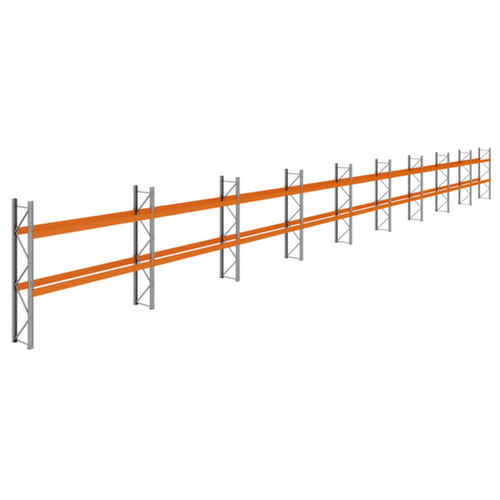 de belangrijkste maten van de palletstelling in één oogopslag:9 stellingvelden met elk 2 niveau(s) met traversen bieden opslagcapaciteit voor in totaal 54 pallets. vakhoogtes zijn afhankelijk van het doel en uw behoeften verstelbaar in stappen van 70 mm. Elk stellingveld biedt 6 palletplaatsen (incl. vloeropslag). opslag dwars. de lengteliggers worden met haken met drie klauwen en uitlichtbeveiliging in het staanderframe gehangen. gebruik eenzijdig - ontworpen voor plaatsing tegen een wand. zeer stabiel door steundragers met gesloten kokerprofielen. constructie van staal. staanders met corrosiebeschermende zinklaag. niveaus in RAL2004 zuiver oranje.