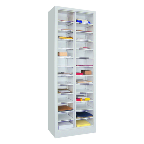 26 vakken bieden voldoende ruimte om bijvoorbeeld papieren, verbruiksartikelen of reserveonderdelen netjes op te bergen. 2 vakken per niveau. vakhoogtes zijn afhankelijk van het doel en uw behoeften verstelbaar in stappen van 17 mm. constructie van staal met slag- en krasvaste poedercoating. niveaus In kleur van de romp.