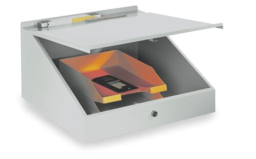 "longDescription": "<h2>Wandconsole</h2><strong>ruimtebesparend schrijf- en opslagoppervlak</strong><br><ul><li>Stabiel en robuust - gelaste plaatstalen constructie</li><li>Opvouwbaar deksel met afrolbare rand aan de voor- en achterkant</li><li>Diefstalbestendig opbergvak met cilinderslot</li></ul><br>De PAVOY-wandtafel is de perfecte werkhulp in productiehallen of werkplaatsen. Ondanks de geringe ruimte biedt hij opbergruimte dankzij een opklapbaar deksel. Afsluitbaar met een cilinderslot, het deksel beschermt de inhoud tegen diefstal. Het bureau heeft een oprolbare rand aan de voor- en achterkant, zodat documenten en pennen altijd binnen handbereik zijn. De stevige constructie van gelast plaatstaal heeft een garantie van 10 jaar.<br><br><strong>Goed om te weten!</strong><br>De hele constructie draagt het GS-keurmerk en is TÜV-getest.<br>",