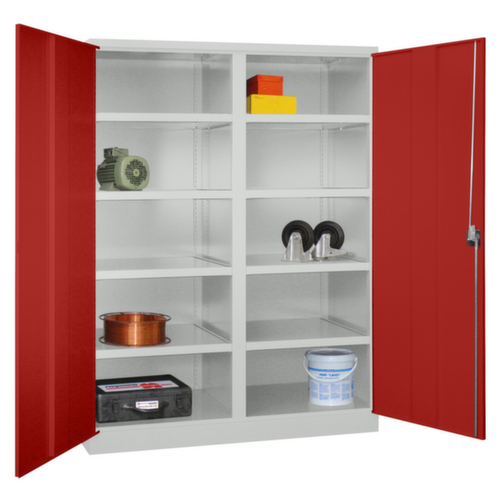 de belangrijkste maten van de PAVOY universele kast Basis in één oogopslag:De romp van de kast is gemaakt van staal en stevig gelast. Dit maakt de constructie zeer robuust en sterk en dus duurzamer. Omdat de hoeken en randen van de romp gelast zijn, is de kast goed afgedicht en dus beter beschermd tegen stof, vocht en vuil dan bij een schroefconstructie. Bovendien is regelmatig onderhoud en nastellen niet nodig. De scheidingswand verdeelt de legborden in twee afzonderlijke vakken voor het overzichtelijker opbergen van verschillende voorwerpen. Links uitgerust met 4 legborden, rechts met 4 legborden. Zeer flexibele binneninrichting door verstelbare vakhoogte per 25 mm. uitgerust met legborden. dubbele vleugeldeur. De inliggende deuren sluiten vlak aan op de romp en hebben dus geen uitstekende randen waar men zich aan kan stoten of waar zich stof kan ophopen. Door het kokerprofiel aan de binnenzijde worden de deuren extra versterkt. Te openen is de stalen kast met draaigreep. afsluitbaar met cilinderslot. De 3-punts-vergrendeling zorgt voor uitstekende stabiliteit en een doeltreffende inbraakbeveiliging.