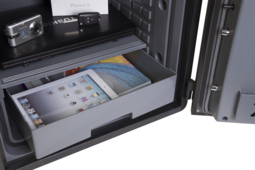 In hoogte verstelbaar legbord, binnendeurvak, 5 sleutelhaken en LED-binnenverlichting voor goed zicht ook in slecht verlichte kasten. met vleugeldeur. afsluitbaar met elektronisch slot met verlicht toetsenbord, geïntegreerd alarm en een noodontgrendeling met 2 sleutels. vergrendeling meer dan 25 mm lange vergrendelingsbout als extra bescherming tegen inbraakpogingen. slotbout Ø 25 mm. Automatische deurvergrendeling bij het sluiten voor onmiddellijke veiligheid. constructie van staal. romp gelakt in zwart. front gelakt in zwart.