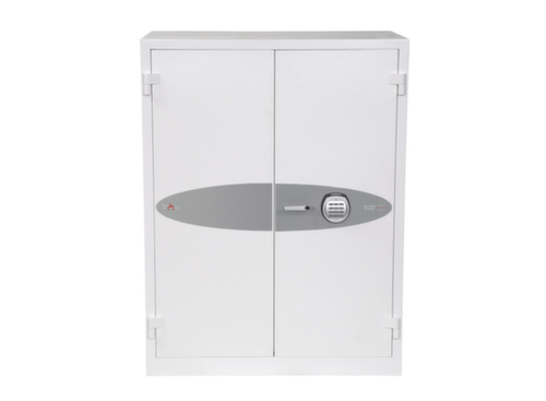 In hoogte verstelbaar legborden met standaard hangrails voor HR-mappen. met dubbele vleugeldeur. afsluitbaar met elektronisch hoog-veiligheidsslot van VdS-klasse II met dubbele besturing, mastercode en tijdvertraging. vergrendeling via een uiterst veilig 3-wegsysteem met spanjolettechniek. Dankzij de techniek is de safe uitgerust met een verhoogde inbraakbeveiliging en uitermate goed beschermd tegen openen met geweld. constructie van staal. romp gelakt in RAL9003 signaalwit. front gelakt in RAL9003 signaalwit.