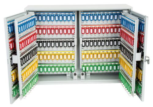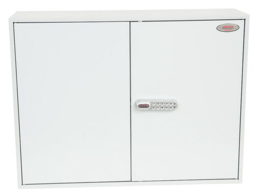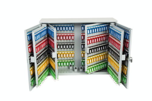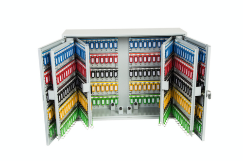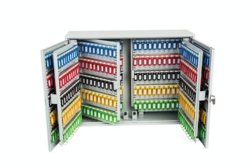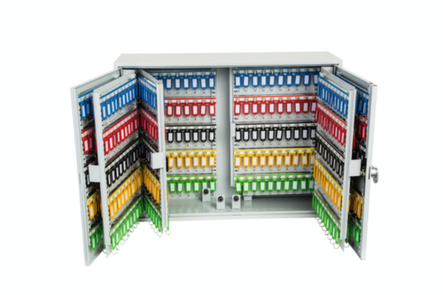 hakenlijsten verstelbaar, genummerd en in verschillende kleuren. De gekleurde sleutelringen en hangers zorgen voor een opgeruimde kast en goed overzicht.. Stofdicht afsluitbaar d.m.v. dubbele openslaande deur. afsluitbaar met elektronisch codeslot dat met een eigen 4-cijferige gebruikerscode kan worden geprogrammeerd en indien nodig eenvoudig kan worden gewijzigd. constructie van staal. romp met slag- en krasvaste poedercoating in grijs. front met slag- en krasvaste poedercoating in grijs. 1DA1E9CBF09DA14CACC1996C68D4375B.