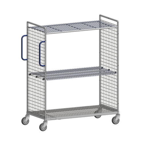 opbouwconstructies: 2 wanden (draadgaas). constructie van stalen buis galvanisch blauw verzinkt. Gemakkelijk te manoeuvreren en verrijden door 4 zwenkwielen. wiel Ø 125 mm. Met zwaar belastbaar, geluidsarm polyurethaan-banden op polyamide-velg.