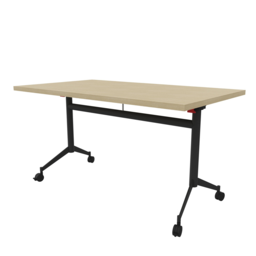 Handig op te bergen, want het tafelblad kan met behulp van de greepstang 90° worden gekanteld. plaatvorm hoekig. T-voetonderstel van metaal met epoxypoedercoating in donkergrijs. ovale buis. 4 wielen onder het frame zorgen voor de nodige mobiliteit op de werkvloer. blad van Spaanplaat met slijtvaste en vochtbestendige melaminecoating in decor eiken. bladdikte 30 mm. alle randen zijn door slagvaste ABS-randen beschermd tegen ontsierende scheuren en beschadigingen. uitgerust met haak- en vergrendelingssysteem om tafelbladen aan de voor- en zijkant te koppelen.