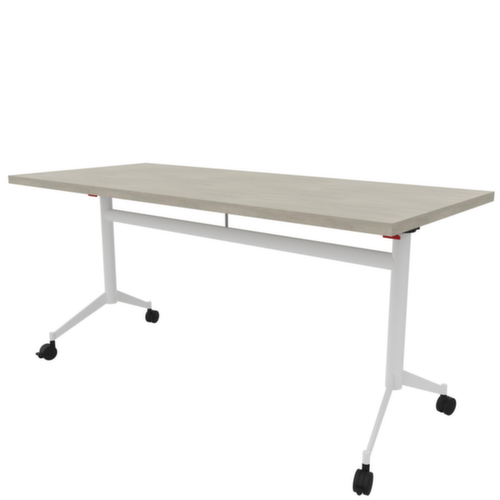Handig op te bergen, want het tafelblad kan met behulp van de greepstang 90° worden gekanteld. plaatvorm hoekig. T-voetonderstel van metaal met epoxypoedercoating in wit. ovale buis. 4 wielen onder het frame zorgen voor de nodige mobiliteit op de werkvloer. blad van Spaanplaat met slijtvaste en vochtbestendige melaminecoating in decor beton. bladdikte 30 mm. alle randen zijn door slagvaste ABS-randen beschermd tegen ontsierende scheuren en beschadigingen. uitgerust met haak- en vergrendelingssysteem om tafelbladen aan de voor- en zijkant te koppelen.