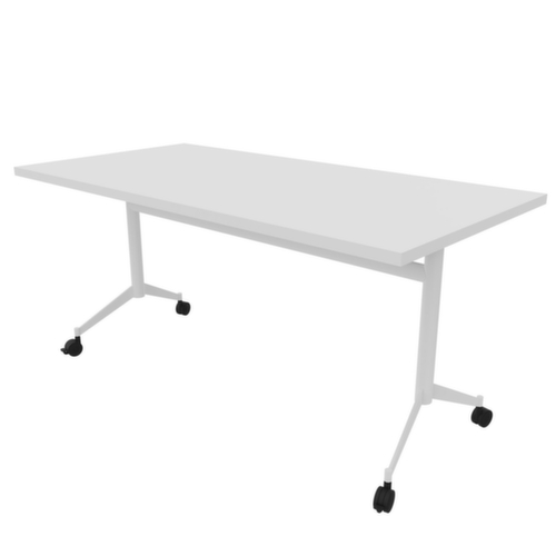 Handig op te bergen, want het tafelblad kan met behulp van de greepstang 90° worden gekanteld. plaatvorm hoekig. T-voetonderstel van metaal met epoxypoedercoating in wit. ovale buis. 4 wielen onder het frame zorgen voor de nodige mobiliteit op de werkvloer. blad van Spaanplaat met slijtvaste en vochtbestendige melaminecoating in decor wit. bladdikte 30 mm. alle randen zijn door slagvaste ABS-randen beschermd tegen ontsierende scheuren en beschadigingen. uitgerust met haak- en vergrendelingssysteem om tafelbladen aan de voor- en zijkant te koppelen.