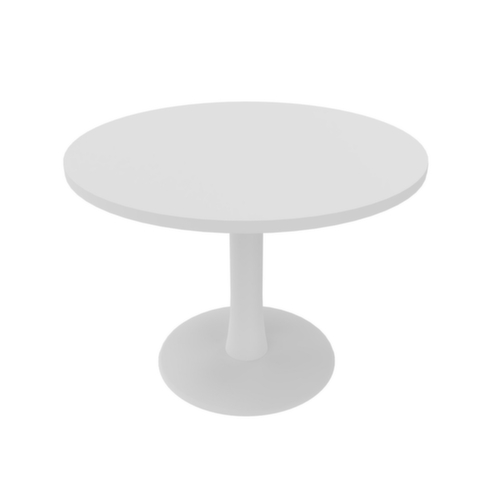 vorm rond. schotelvoetframe van staal met epoxypoedercoating in wit, kolom met epoxypoedercoating. ronde buis. blad van Spaanplaat met slijtvaste en vochtbestendige melaminecoating in decor wit. bladdikte 30 mm. rand met slagvaste ABS-omranding ter bescherming tegen lelijke barsten en beschadigingen. bladrand in wit.