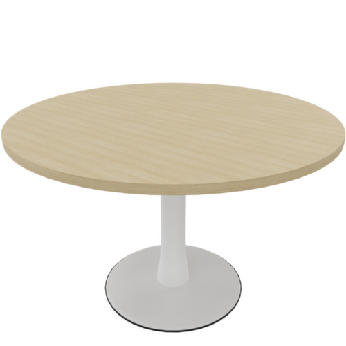 vorm rond. schotelvoetframe van staal met epoxypoedercoating in wit, kolom met epoxypoedercoating. ronde buis. blad van Spaanplaat met slijtvaste en vochtbestendige melaminecoating in decor eiken. bladdikte 30 mm. rand met slagvaste ABS-omranding ter bescherming tegen lelijke barsten en beschadigingen. bladrand in eiken.