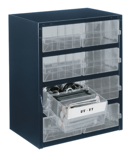 behuizing van staal gelakt in donkerblauw / lades van breukvast polypropyleen. laden in transparant. etikettenlijst.