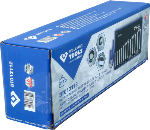 "longDescription": "12-delige set,vervaardigd volgens DIN 3113,fijne vertanding met 72 tanden,omkeerhoek van 5°,rechte vorm,mat verchroomd,chroom vanadium,in praktische opbergtas met ophangogen,De 12-delige BRILLIANT TOOLS ratelringsleutelset BT013112 is vervaardigd volgens DIN 3113. De metrische ratelringsleutels zijn fijn getand met 72 tanden en hebben een omkeerhoek van 5°. De moersleutels hebben een rechte vorm en een bekstand van 15°. Het oppervlak is mat verchroomd, waardoor het ook bijzonder goed in de hand ligt. De ratelringsleutelset met de maten 8 mm t/m 19 mm wordt geleverd in een praktische opbergtas die is voorzien van ophangogen.,,Bij de levering inbegrepen: 8 mm, 9 mm, 10 mm, 11 mm, 12 mm, 13 mm, 14 mm, 15 mm, 16 mm, 17 mm, 18 mm, 19 mm ONZE KWALITEIT: BRILJANT,ONZE PRIJZEN: SMART,In elk stuk gereedschap zit meer dan een kwart eeuw ervaring van onze experts. Deze compromisloze kwaliteit, professioneel gereedschap met de hoogste kwaliteit voor het zware dagelijkse werk, is voor ons een van de succesrecepten. Wij hebben geen grote verkoopstructuur en extravagante marketingactiviteiten en kunnen u de producten dus aanbieden tegen een sensationeel gunstige prijs-kwaliteitverhouding. Bespaar geld zonder uw kwaliteitsnormen te verlagen! Een kwaliteitsgereedschap van KS TOOLS.<br>",