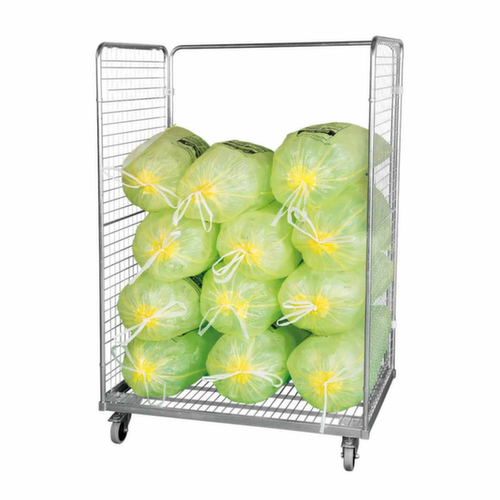 opbouwconstructies: 2 wanden (draadgaas). In euromaat. constructie van staal galvanisch blauw verzinkt. Een extra stabiliteitsstang maakt de tweezijdige rolcontainer extra stabiel. platform van draadgaas. Gemakkelijk te manoeuvreren en verrijden door 4 zwenkwielen. wiel Ø 125 mm. met vloervriendelijk elastiek-banden. wielnaaf met kogellager. De rem aan 2 zwenkwielen zorgen voor een stevige stand.