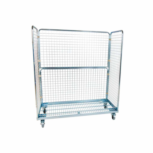 opbouwconstructies: 3 wanden (draadgaas). constructie van staal galvanisch blauw verzinkt. platform van draadgaas. Gemakkelijk te manoeuvreren en verrijden door 4 zwenkwielen. wiel Ø 125 mm. Met vloervriendelijk elastiek-banden op polyamide-velg. De rem aan 2 zwenkwielen zorgen voor een stevige stand.