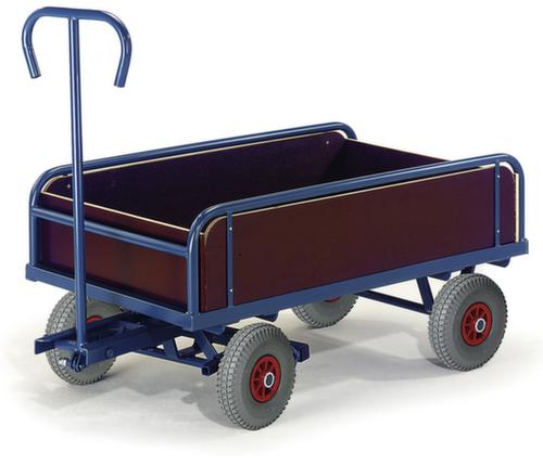 "metaDescription": "Rollcart 2-assige handtrekwagen met stuurmechanisme, draagvermogen 400 kg, laadvlak lengte x breedte 930 x 535 mm - draagverm. 400kg, laadvl. LxB 930x535mm, houtplaat, 4schotten, RAL5010,4wielen, lucht-banden",