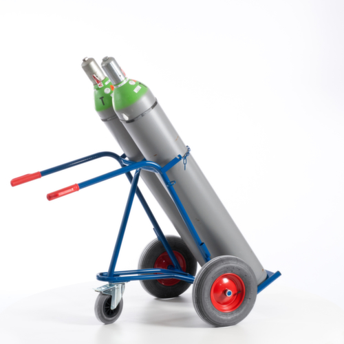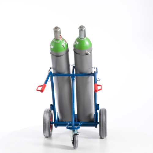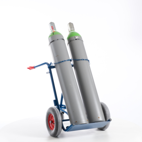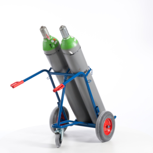 "longDescription": "<h2>Flessentrolley</h2><strong>voor het veilig vervoer van gasflessen</strong><br><ul><li>Hoge stabiliteit dankzij gelaste stalen constructie</li><li>Slag- en krasbestendig oppervlak - frame met poedercoating</li><li>Geen uitvallen - flessenhouders met kettingbeveiliging </li><li>Naven met rollagers</li></ul><br><h3>Je hebt de keuze:</h3><ul><li>Wielen met blauwgrijze massief rubber of luchtbanden op kunststof velgen.</li></ul><br>Deze cilinderwagen van Rollcart helpt om verschillende gasflessen gemakkelijk en handig te vervoeren. De stevige gelaste stalen constructie heeft een garantie van 5 jaar. Dankzij de poedercoating is het oppervlak permanent beschermd en slag- en krasvast.<br><br>Om te voorkomen dat de gascilinder tijdens het vervoer naar beneden valt, is de cilinderwagen uitgerust met een cilinderhouder en een ketting. <br><br>De banden van de cilinderwagen zijn verkrijgbaar met massief rubber of met luchtbanden. Massief rubberen banden zijn bijzonder geschikt voor hoge belastingen en tamelijk vlakke ondergronden, luchtbanden voor middelzware belastingen en oneffen terreinomstandigheden. Beide banden zitten op kunststof velgen en de naven zijn met rollagers.<br>",