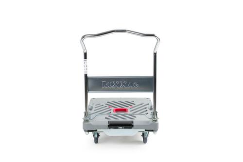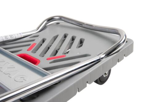 constructie van staal (geschroefd). platform van kunststof. platform doorbroken met greepuitsparing in het laadvlak. Dankzij de uitsparing in het midden is de ingeklapte platformwagen gemakkelijk en handig vast te pakken en onder de arm te dragen. platform Waterdicht. duwbeugel in-/uitklapbaar. onderstel in grijs. De 2 zwenk- en 2 bokwielen die eronder zijn gemonteerd, sporen uitstekend en rollen moeiteloos op rechte en bochtige trajecten, waardoor rijden weinig krachtsinspanning kost, de remmen van de twee achterwielen zorgen altijd voor een stevige stand. wiel Ø 130 mm. wielen met lekvrij, vloervriendelijk massief rubber-banden.Onze klantenservice helpt u graag verder.
