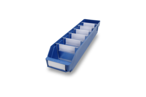 van breukvast polypropyleen, in blauw. zijdelingse groefgeleidingen en bodembevestigingen om dwarsverdelers in te steken voor een individuele bakindeling. zichtopening. met etiketteervlak. temperatuurbestendig van -20 °C tot +80 °C. materiaal geschikt voor levensmiddelen.