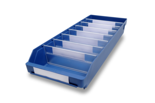 van breukvast polypropyleen, in blauw. zijdelingse groefgeleidingen en bodembevestigingen om dwarsverdelers in te steken voor een individuele bakindeling. zichtopening. met etiketteervlak. temperatuurbestendig van -20 °C tot +80 °C. materiaal geschikt voor levensmiddelen.