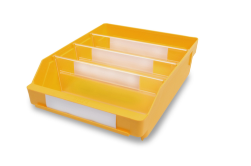 van breukvast polypropyleen, in geel. zijdelingse groefgeleidingen en bodembevestigingen om dwarsverdelers in te steken voor een individuele bakindeling. zichtopening. met etiketteervlak. temperatuurbestendig van -20 °C tot +80 °C. materiaal geschikt voor levensmiddelen.