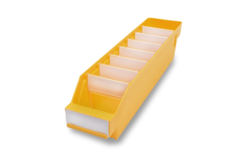 van breukvast polypropyleen, in geel. zijdelingse groefgeleidingen en bodembevestigingen om dwarsverdelers in te steken voor een individuele bakindeling. zichtopening. met etiketteervlak. temperatuurbestendig van -20 °C tot +80 °C. materiaal geschikt voor levensmiddelen.