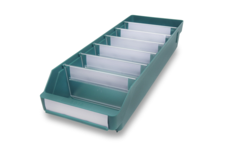 van breukvast polypropyleen, in groen. zijdelingse groefgeleidingen en bodembevestigingen om dwarsverdelers in te steken voor een individuele bakindeling. zichtopening. met etiketteervlak. temperatuurbestendig van -20 °C tot +80 °C. materiaal geschikt voor levensmiddelen.