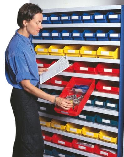 van breukvast polypropyleen, in rood. zijdelingse groefgeleidingen en bodembevestigingen om dwarsverdelers in te steken voor een individuele bakindeling. zichtopening. met etiketteervlak. temperatuurbestendig van -20 °C tot +80 °C. materiaal geschikt voor levensmiddelen.