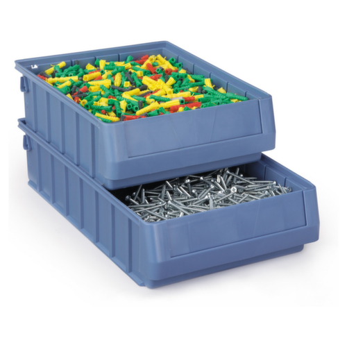 Legbordbakken zonder zichtbare openingen zijn ideaal voor elk magazijn of werkplaats. Dankzij de rechte hoeken is het interne volume bijzonder groot en heb je veel meer opslagruimte dan bij vakkenbakken met afgeronde hoeken. De verzonken handgreep maakt het gemakkelijker om de stellingbakken vast te pakken en te dragen. Een goede hantering wordt ondersteund door de gladde binnenwanden en de gladde bodem en de stellingbakken kunnen ook handig worden gebruikt als stapelbakken. De stapelvoet en de versterkte stapelrand rondom dragen bij aan veilig stapelen. De enorme inhoud en stapelbelasting zijn bijzonder gunstig voor gebruik in magazijnen en de industrie. De stapelbakken zijn ook zeer breukvast en bestand tegen smeermiddelen, zuren en vetten.Praktisch: de kunststof opslagbakken kunnen worden gebruikt op transportbandsystemen en hebben inkepingen voor lengte- en dwarsverdelers. Met deze tussenschotten kun je extra tussenschotten maken en dingen georganiseerd houden.Alle details in één oogopslag:Opbergbakken zonder zichtbare opening- Groot inwendig volume dankzij geoptimaliseerd hoekontwerp- Veilig stapelen dankzij stapelvoet en versterkte randen- Verzonken handgreep voor eenvoudig hanteren- Onbreekbaar en bestand tegen smeermiddelen, zuren en vetten- Kan veilig worden gebruikt op transportbandsystemen- Ideale aanvulling voor het opbergen van kleine onderdelen- Materiaal: polypropyleen (PP)- Kleur: duifblauw- Kunststof opbergbakken- Geleverd met label voor etiketteringKijk naar ons hele assortiment opbergbakken. Heb je bijpassende rekken nodig of wil je een set bestaande uit rekken en opbergbakken? Je vindt gegarandeerd wat je zoekt.