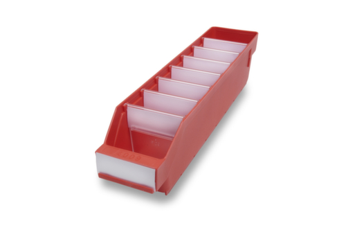 van breukvast polypropyleen, in rood. zijdelingse groefgeleidingen en bodembevestigingen om dwarsverdelers in te steken voor een individuele bakindeling. zichtopening. met etiketteervlak. temperatuurbestendig van -20 °C tot +80 °C. materiaal geschikt voor levensmiddelen.