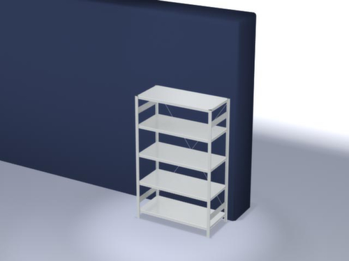 de belangrijkste maten van de hofe magazijnstelling in één oogopslag:5 niveaus met Stalen bodem. 3-voudige veiligheidsrand van 40 mm hoog en gesloten hoeken zorgt voor hoge stabiliteit en bescherming tegen verwondingen. vakhoogtes zijn afhankelijk van het doel en uw behoeften verstelbaar in stappen van 25 mm. opstelhoek recht. gebruik eenzijdig - ontworpen voor plaatsing tegen een wand. Hoge stabiliteit door diagonaalschoren. Door gegolfde verbindingsplaten in de diepterichting en stalen voetplaten staat de stelling zeer stevig. De profielafdekkappen bovenaan zorgen voor een nette afwerking. constructie van staal, staanders verzinkt met kunststof coating in RAL7035 lichtgrijs, niveaus verzinkt met kunststof coating in RAL7035 lichtgrijs.