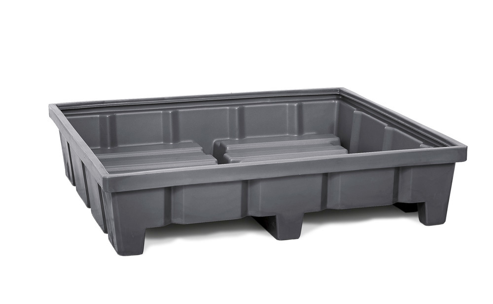 De belangrijkste maten van de van de opvangbak in één oogopslag:van slagvast polyethyleen in zwart. vorkkoker, onderrijdhoogte 100 mm voor transport met vorkheftruck. Van de brede zijde inrijdbaar.