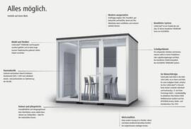 4 wanden (2 dichte wanden en 2 glaswanden). pakket voor geluiddemping, vorksloffen, pakket voor elektrische installatie, stekkerdoos en LED-verlichting en natuurlijke ventilatie. Met verbeterde geluiddemping dankzij 8 mm geluiddempend, gelaagd veiligheidsglas, deurvloerafdichting tegen geluid, speciale geluiddempende afdichtingsstrips en steenwolvulling met een hoge massadichtheid (110 kg/m³) voor wand- en plafondelementen. glazen deur. constructie van staal met coating in RAL9006 blank aluminiumkleurig. met isolatie van minerale wol. Eenvoudig te verplaatsen door vorkkoker.