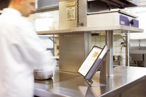 "longDescription": "Stabiele tafelstandaard gemonteerd in roestvrij staal, (schuine basis) incl. 10 Sterifold displayborden (antibacterieel) DIN A4 in zwart. <br/> Dankzij een exclusieve technologie stoppen de zilverionen van de Sterifold-displayborden de vermenigvuldiging van microben en vernietigen ze micro-organismen die een gevaar vormen voor de gezondheid. <br/> 5 clip-on tabs 50 mm (kartonnen inzetstukken neutraal/gekleurd) met 4 pluggers (eindstukken met stoppen) voor een ideale en optimale leeshoek. <br/> Displaybord van slijtvast, flexibel en antibacterieel PVC, omlijst met gekleurde, met kunststof beklede staaldraad. <br/> Roestvast stalen draaipunt ter bescherming tegen roest. <br/> Opening aan de bovenkant. <br/> De tafelstandaard kan met 1 à 2 wandelementen Sterifold (414567) worden uitgebreid tot 20 à 30 borden. <br/> Wandmontage mogelijk.<br>",