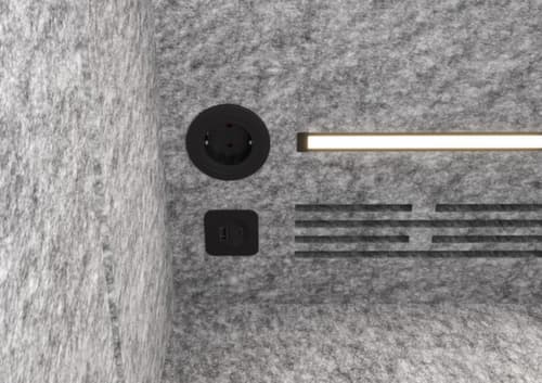 "value": "<h2>Moderne elektrische uitrusting voor productief werken</h2><p>De ruimte-in-ruimte oplossing 'silent space' biedt alles wat u nodig heeft om mobiel te werken. Een stopcontact van 220 V met moderne USB-A- en USB-C-aansluitingen (elk 16 W) maakt het mogelijk om een laptop, smartphone en andere apparaten tegelijkertijd te laden zonder aparte adapter.\nDe elegante integratie van de aansluitingen in het plafond en de doordachte plaatsing zorgen voor een opgeruimd werkoppervlak. Zo blijft u altijd verbonden – efficiënt, modern en onafhankelijk.</p>"