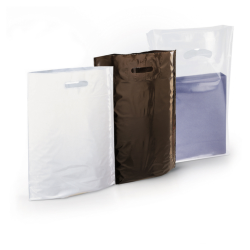 Plastic draagtassen zijn een goedkope en duurzame oplossing voor het verpakken van uw producten. De klassieke plastic zak met DKT-handvat is ideaal voor platte producten zoals brochures, catalogi, kleding en platte geschenken. Bovendien zijn plastic draagtassen waterafstotend en beschermen ze uw producten dus uitstekend tegen vocht, terwijl het versterkte handvat comfortabel is en langer dragen geen enkel probleem maakt. Neem dan contact met ons op! Je kunt meteen meer draagtassen op maat maken - met Rajaprint! Neem contact op met ons team van experts voor plastic draagtassen op maat.Alle details in één oogopslag: - Bijzonder slijtvast- Hoog draagcomfort dankzij versterkte greepopening- Keuze uit 3 kleuren: transparant, wit en bruin- Herbruikbaar- Verkrijgbaar met of zonder bodemvouw voor eenvoudig vullen- Materiaal: LDPE- Kwaliteit: 50 µ- Verpakkingseenheid (PU): 200 stuks- Liever kleurrijke plastic draagtassen of papieren draagtassen?