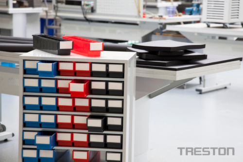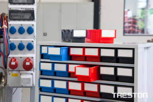 behuizing van staal met slag- en krasvaste poedercoating in RAL7035 lichtgrijs / lades van breukvast polypropyleen. laden in blauw. ladebodem gegolfd voor het gemakkelijker pakken van kleine artikelen. met stelvoeten voor eenvoudig aanpassen aan oneffenheden in de vloer.