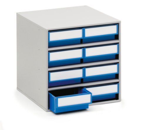 behuizing van staal met slag- en krasvaste poedercoating in RAL7035 lichtgrijs / lades van breukvast polypropyleen. laden in blauw. ladebodem gegolfd voor het gemakkelijker pakken van kleine artikelen. om aan de wand te hangen of vrijstaand te plaatsen.