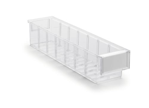"longDescription": "<h2>Transparante assortimentsdoos</h2><strong>met grote verzonken grepen voor gemakkelijk optillen</strong><br><ul><li><strong>netjes geordend</strong> - met extra groot etiket en etiketbeschermer</li><li><strong>snel overzicht</strong> - bak van transparant polystyreen</li><li><strong>veilig optillen</strong> - ergonomische verzonken grepen aan voor- en achterzijde</li><li>Nauwkeurig stapelbaar dankzij de stapelrand rondom</li><li>Kan op elk moment worden verlengd - gegroefde geleider voor dwarsfrezen</li><li><strong>veelzijdig inzetbaar</strong> - ongevoelig voor de meeste oliën, zuren en logen en bestand tegen temperaturen van -40°C tot +55°C</li></ul><br>De Treston opbergbakken met open voorzijde zijn ideaal voor het opbergen van uw kleine onderdelen. Door de transparantie van het materiaal kunt u altijd zien wat er in de bakken zit. U kunt ze ook labelen met de grote etiketten, zodat uw opbergruimte voor kleine onderdelen individueel en perfect georganiseerd is. Dit bespaart tijd omdat iedereen snel de onderdelen kan vinden die hij nodig heeft. Met de verzonken greep kunt u de bakken voor kleine onderdelen snel en gemakkelijk uittrekken of optillen.<br><br>Polystyreen is absoluut stabiel en heeft zeer goede isolerende eigenschappen. Het is chemisch bestand tegen oplosmiddelen en vloeistoffen op waterbasis. Dit maakt de open opbergkist tot een duurzame, veilige en praktische plaats om uw kleine onderdelen op te bergen.<br><br><strong>Goed om te weten!</strong><br>Praktische dwarsverdelers voor het indelen van de bakken zijn verkrijgbaar als accessoire.<br>",