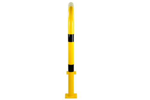 de belangrijkste maten van het UDOBÄR aanrijdbeveiligingssysteem in één oogopslag:van staal met slag- en krasvaste poedercoating in geel/zwart. voor vastschroeven aan bodemplaat.