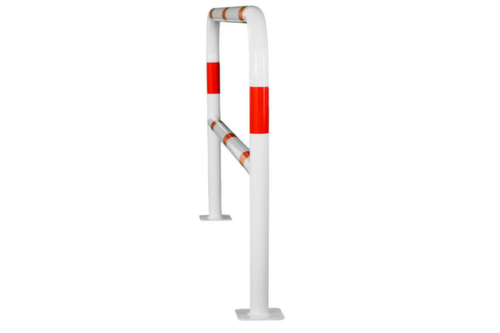 de belangrijkste maten van het UDOBÄR aanrijdbeveiligingssysteem in één oogopslag:constructie met tussenbuis. van staal met slag- en krasvaste poedercoating in wit/rood. Vastschroefbaar door aangebrachte gaten.