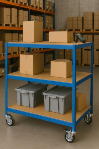 niveaus per 40 mm verstelbaar. etage(s) van spaanplaat. etage(s) met oplegtraversen rondom en legborddwarsliggers, recht. onderstel met slijtvaste kunststof coating in blauw. staalconstructie. Gemakkelijk te manoeuvreren en verrijden door 4 zwenkwielen, remmen op twee zwenkwielen zorgen altijd voor een stevige stand. wiel Ø 100 mm. wielen met rubber-banden. wielnaaf met kogellager. behuizing van staal.