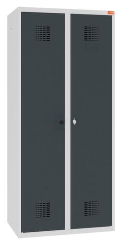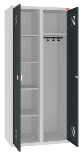 links uitgerust met 4 legborden, rechts met 1 hoedenplank en kledingstang. Via de dubbele openslaande deur is de kast zeer goed toegankelijk. De openslaande deuren bieden het voordeel dat er in de kast geen ruimteverlies optreedt, omdat ze in de kast geen plaats innemen. afsluitbaar met draaigrendelsluiting. vakken gezamenlijk afsluitbaar. De gestandaardiseerde WEMO-perforatie zorgt voor optimale luchtcirculatie in de kast. De sokkel onder de kast zorgt ervoor dat het gewicht van de kast gelijkmatig over de vloer wordt verdeeld. Hierdoor staat de kast stabieler en kan hij zwaardere lasten dragen dan een kast met voeten. En omdat er geen vuil, stof en vocht onder kan komen, hoeft er onder de kast niet te worden schoongemaakt. constructie van plaatstaal. romp met corrosiebestendige zirkoniumcoating in RAL7035 lichtgrijs, front met corrosiebestendige zirkoniumcoating in RAL7016 antracietgrijs.