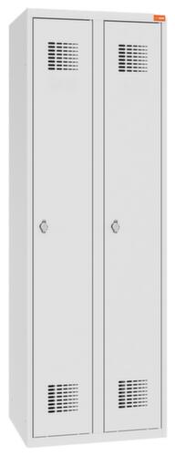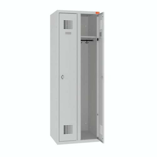per vak 1 hoedenplank, 1 kledingstang met 2 haken, spiegel in de deur. openslaande deur met etikettenhouder. De openslaande deuren bieden het voordeel dat er in de kast geen ruimteverlies optreedt, omdat ze in de kast geen plaats innemen. afsluitbaar met draaigrendelsluiting. De gestandaardiseerde WEMO-perforatie zorgt voor optimale luchtcirculatie in de kast. De sokkel onder de kast zorgt ervoor dat het gewicht van de kast gelijkmatig over de vloer wordt verdeeld. Hierdoor staat de kast stabieler en kan hij zwaardere lasten dragen dan een kast met voeten. En omdat er geen vuil, stof en vocht onder kan komen, hoeft er onder de kast niet te worden schoongemaakt. constructie van plaatstaal. romp met corrosiebestendige zirkoniumcoating in RAL7035 lichtgrijs, front met corrosiebestendige zirkoniumcoating in RAL7035 lichtgrijs.