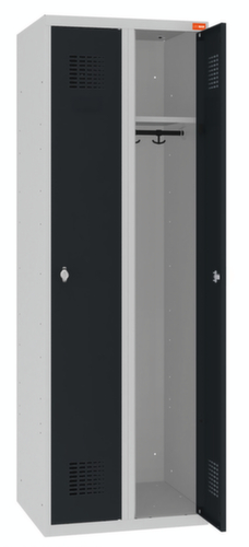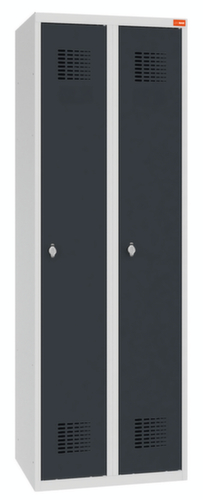 per vak 1 hoedenplank, 1 kledingstang met 2 haken, spiegel in de deur. openslaande deur met etikettenhouder. De openslaande deuren bieden het voordeel dat er in de kast geen ruimteverlies optreedt, omdat ze in de kast geen plaats innemen. afsluitbaar met draaigrendelsluiting. De gestandaardiseerde WEMO-perforatie zorgt voor optimale luchtcirculatie in de kast. De sokkel onder de kast zorgt ervoor dat het gewicht van de kast gelijkmatig over de vloer wordt verdeeld. Hierdoor staat de kast stabieler en kan hij zwaardere lasten dragen dan een kast met voeten. En omdat er geen vuil, stof en vocht onder kan komen, hoeft er onder de kast niet te worden schoongemaakt. constructie van plaatstaal. romp met corrosiebestendige zirkoniumcoating in RAL7035 lichtgrijs, front met corrosiebestendige zirkoniumcoating in RAL7016 antracietgrijs.